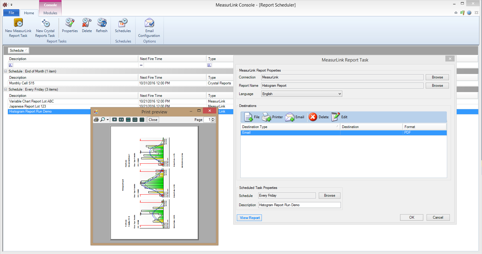 A preview mode allows users to see the report before scheduling the report task. Users can assign intervals for reports to be generated on an hourly, daily, weekly, monthly and yearly intervals. Simply define a schedule for a report and assign it to a report task. Reports also can be printed, emailed and exported in formats such as a PDF. Multiple destinations can be assigned to a reporting task.